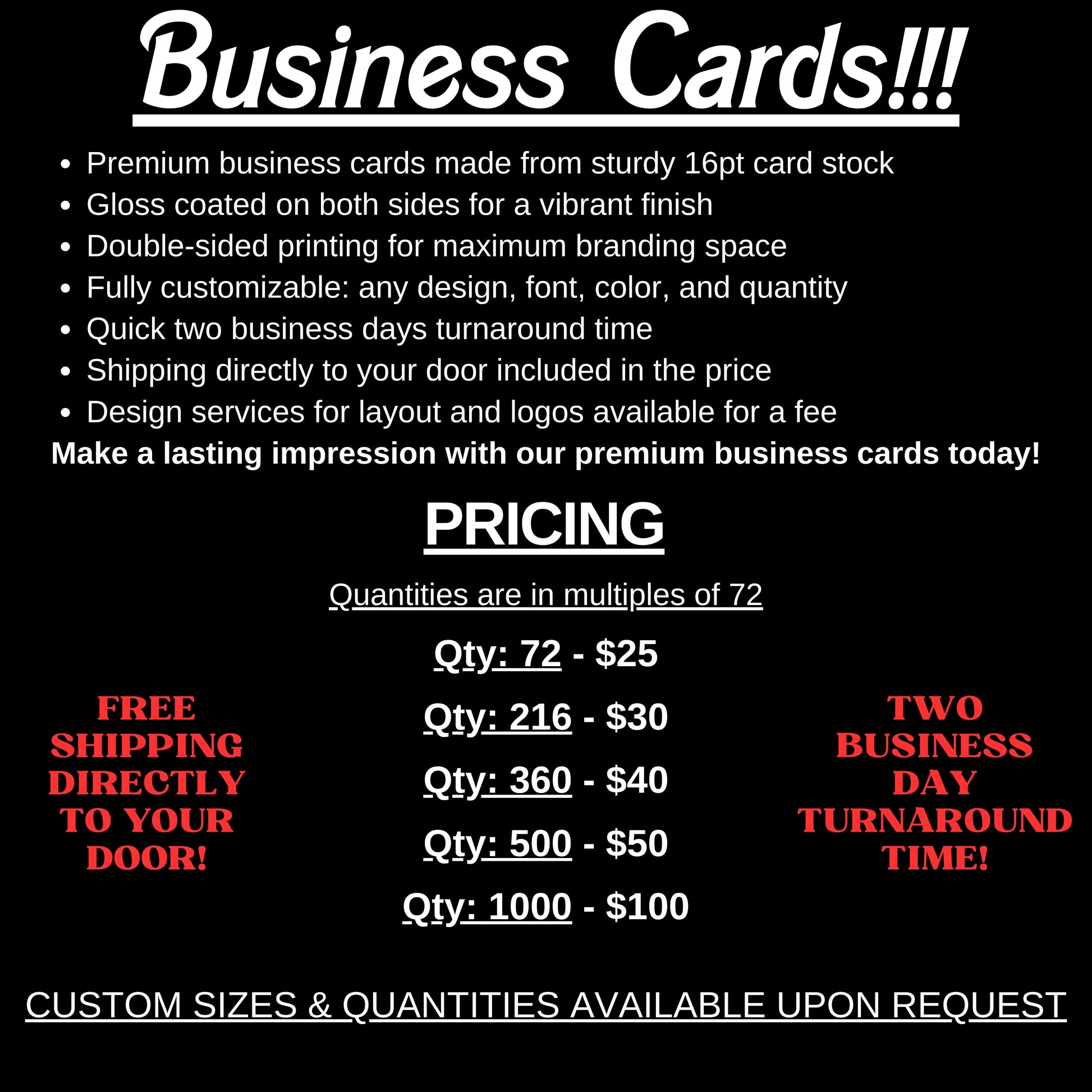 Make a lasting impression with our premium business cards, crafted from durable 16pt card stock and gloss coated on both sides for a stunning finish. Enjoy double-sided printing to maximize your branding space, with complete customization available—choose any design, font, color, and quantity to suit your needs. With a quick turnaround time of just two business days, your cards will be ready in no time. If you need assistance with your layout or logo, our design services are available for a $15 fee. Elevate your networking game with our premium business cards today!